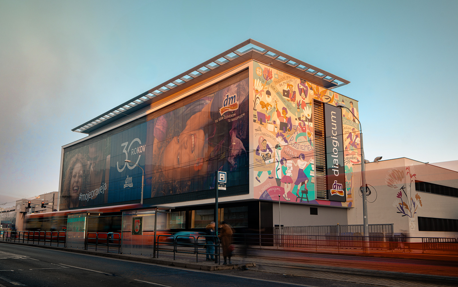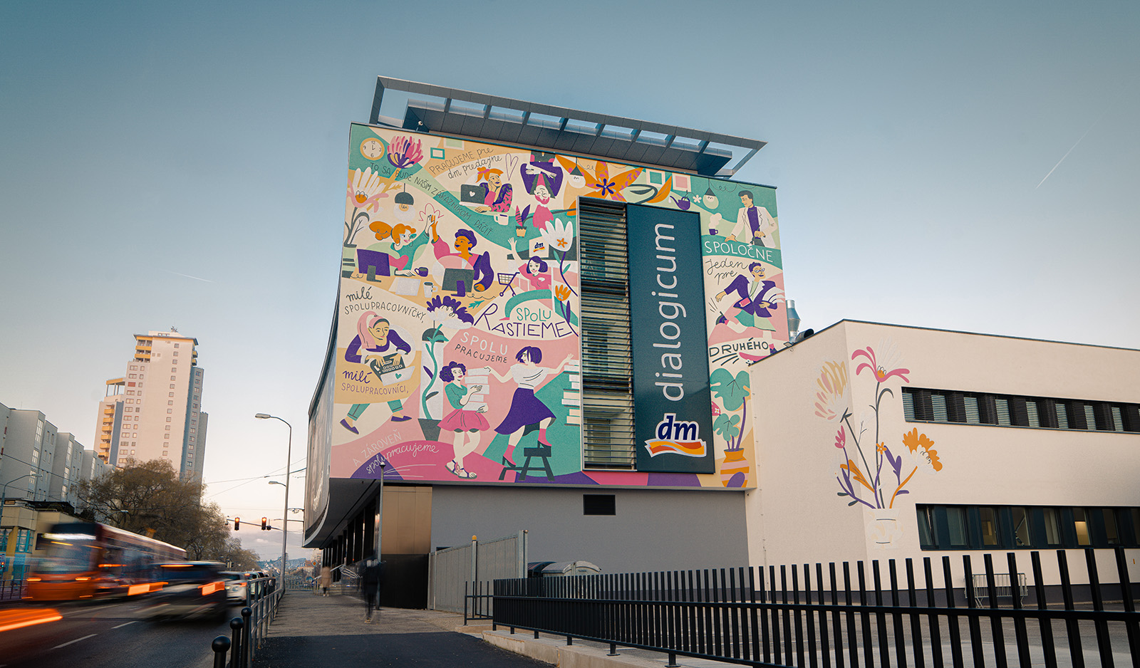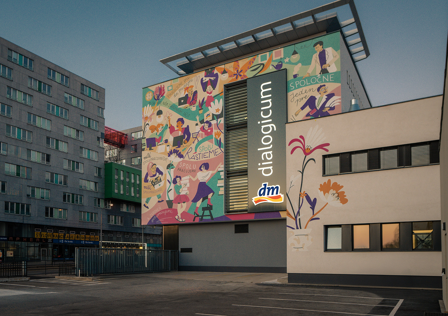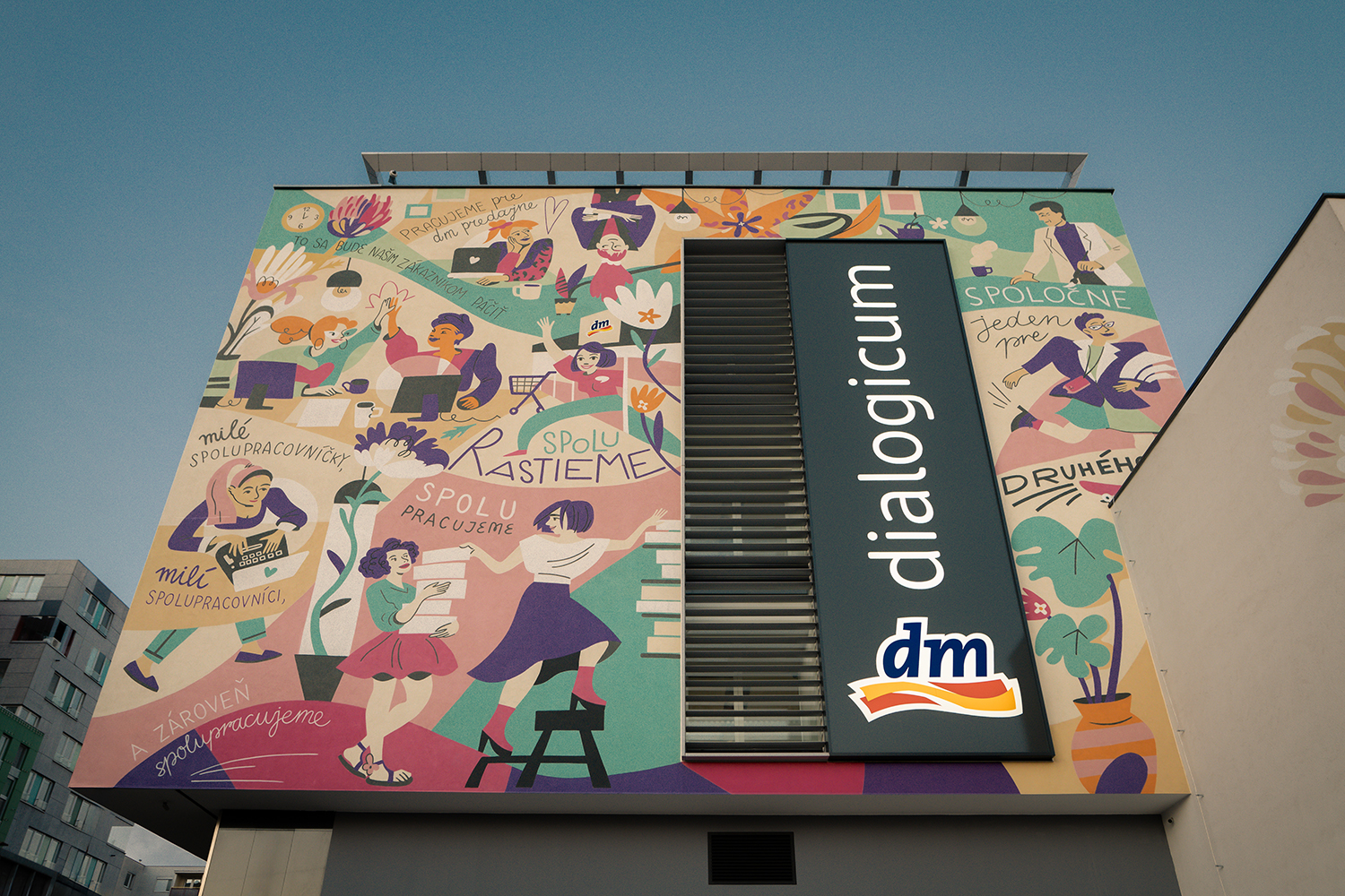 Pre nové sídlo spoločnosti dm drogerie markt na Záhradníckej ulici v Bratislave sa realizoval veľkoformátový mural o rozlohe približne 180 m². Maľba vznikla podľa vizuálneho návrhu ilustrátorky Sasha Chagina, s ktorou dm dlhodobo spolupracuje. Mural je umiestnený na fasáde novej administratívnej budovy a nesie jej charakteristický rukopis: dynamické postavy, výraznú farebnosť a motívy založené na rozmanitosti a ľudskosti. Mojou úlohou bola kompletná realizácia maľby vo veľkej mierke. Výsledkom je výrazný vizuálny prvok novej budovy, viditeľný aj z diaľky z frekventovanej Záhradníckej ulice.