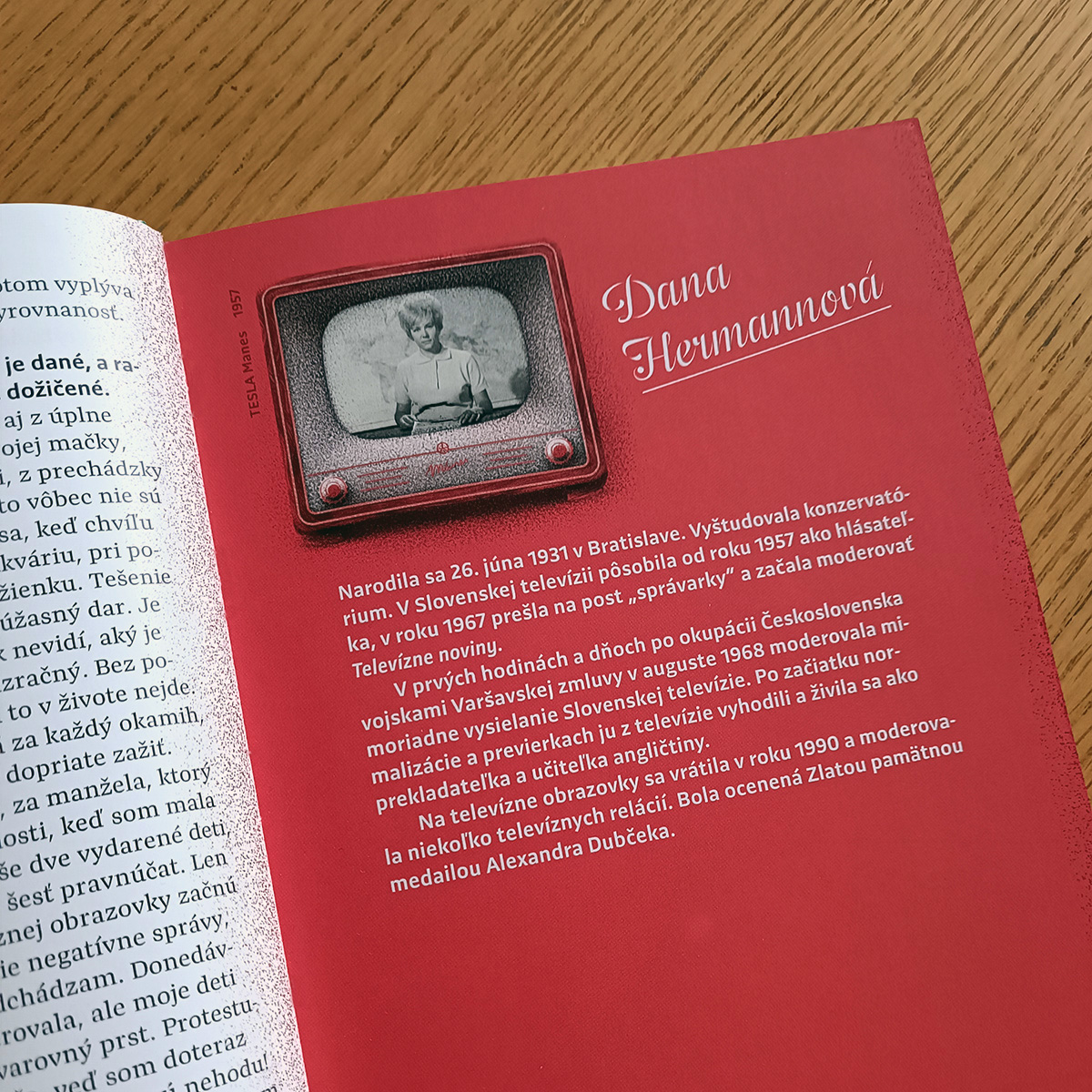 Séria ilustrácií historických televízorov do knihy, ktorá vypovedá o profesii televíznej hlásateľky – jej vývoji a zákulisí v slovenskom televíznom vysielaní. V každom modeli televízora sa objavuje fotografia hlásateľky pôsobiacej v danom čase. Súčasťou projektu bol aj návrh obálky knihy.