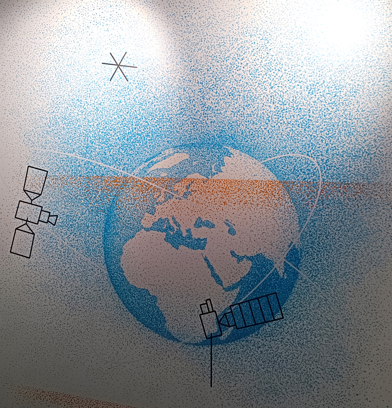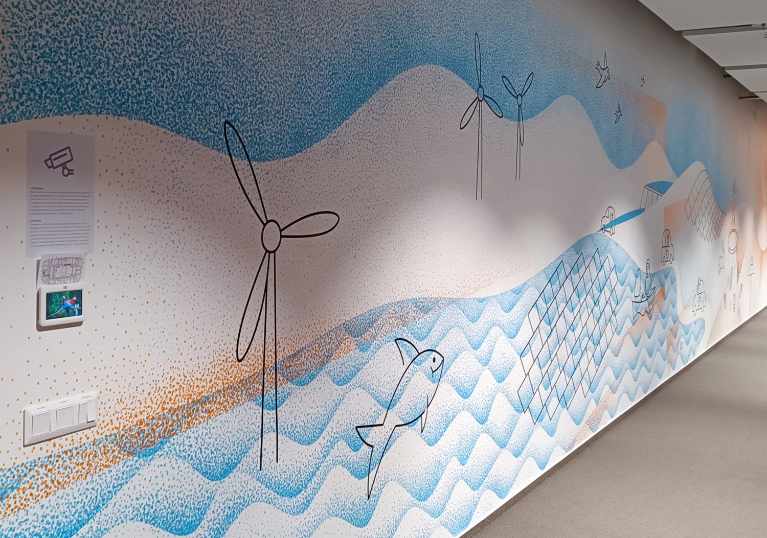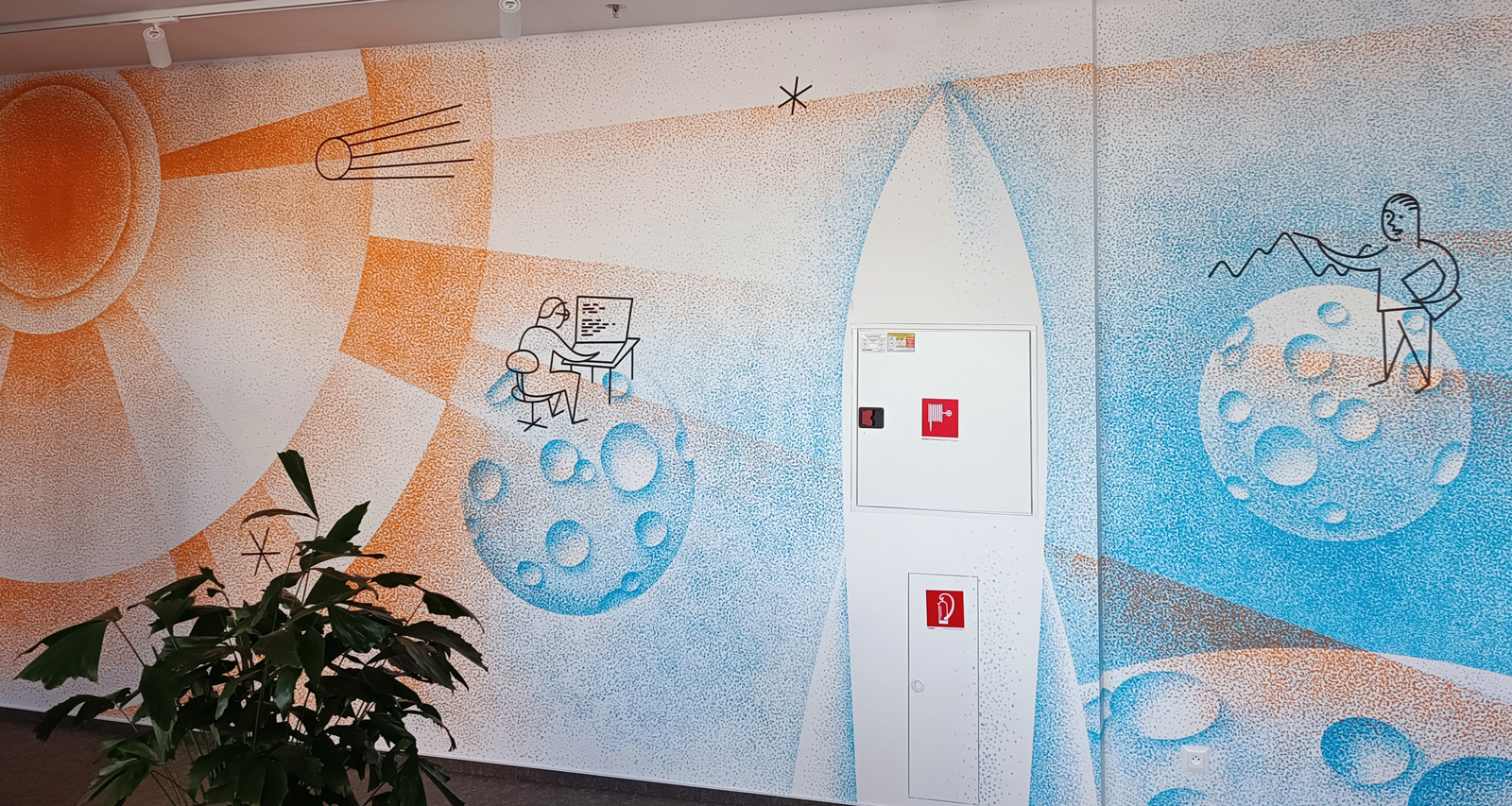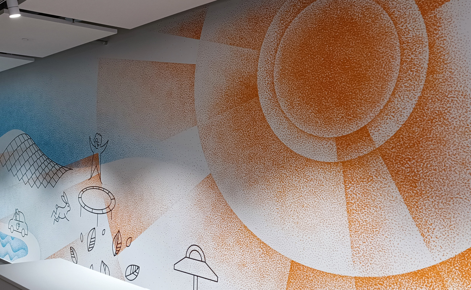 Pre firmu Solargis, ktorá poskytuje meteodáta, softvérové riešenia a odborné poradenstvo v oblasti solárnej energie, som vytvoril interiérový mural rozložený na troch stenách a dvoch poschodiach ich firemných priestorov. Každá stena spracúva tému slnka v inom kontexte, ako astronomický stred našej slnečnej sústavy, ako zdroj energie premieňanej na elektrinu a napokon ako symbol pozitívnej energie pre ľudí s mestskou scenériou plnou pohybu a oddychu. Celý mural vznikol kombinovanou technikou: podklad pomocou vlastného bodkovacieho nástroja, následne nalepené postavy a objekty vyrezané zo samolepiacej fólie. Výsledkom je čistý, moderný vizuál s výrazným rytmom a hravou kompozíciou.